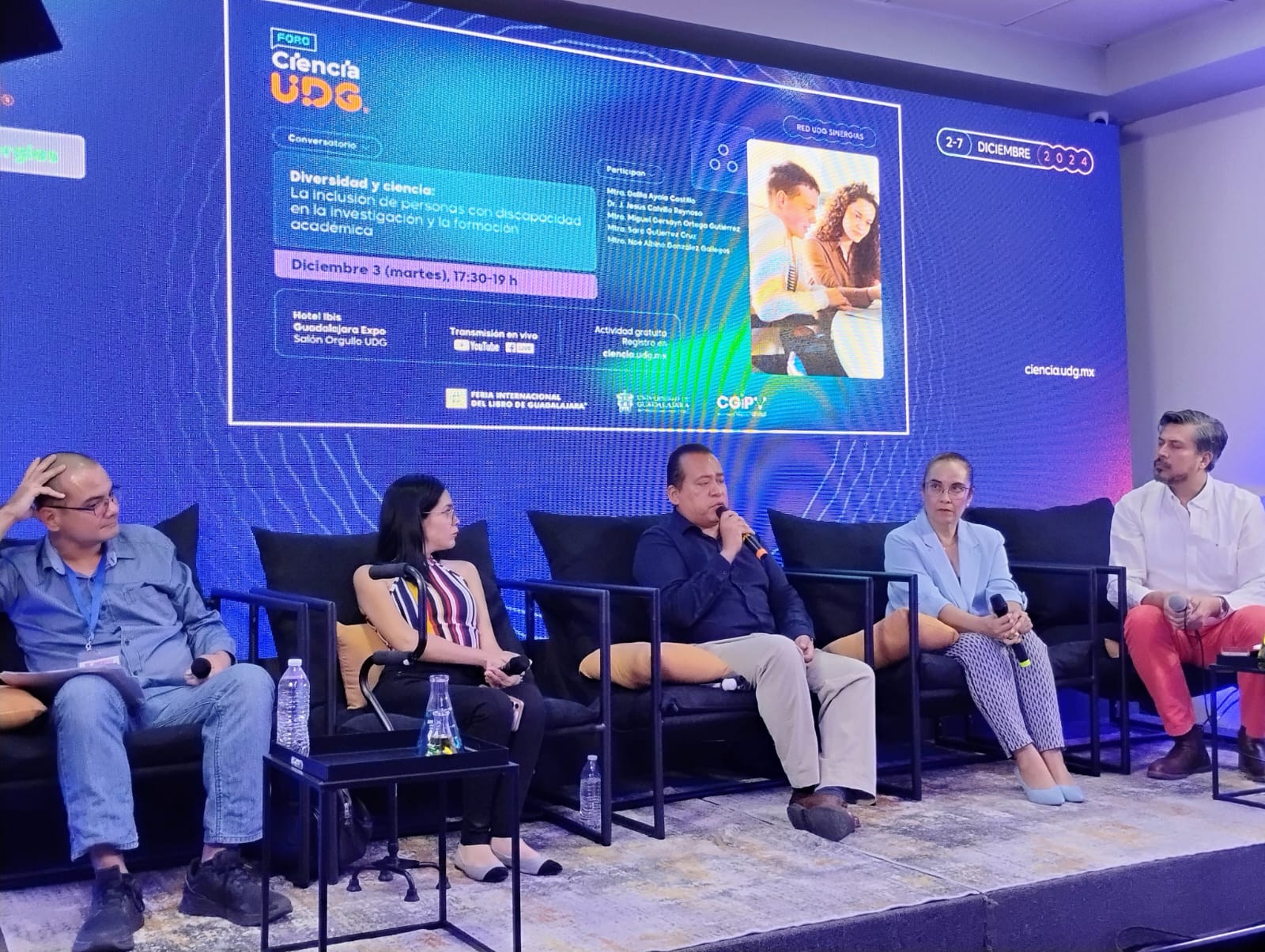 En el Salón Orgullo UdeG del Hotel Ibis, como parte del Foro Ciencia UdeG, se llevó a cabo el conversatorio titulado “Diversidad y ciencia: La inclusión de personas con discapacidad en la investigación y la formación académica”. El evento reunió a especialistas comprometidos con la construcción de una educación superior más inclusiva, contando con la participación de la Mtra. Dalila Ayala Castillo, el Dr. J. Jesús Calvillo Reynoso, el Mtro. Miguel Ortega Gutiérrez y la Mtra. Sara Gutiérrez Cruz, bajo la moderación de la Mtra. Noé Albino González Gallegos.